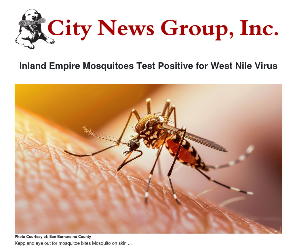 Mosquitoes collected in the city of Colton have tested positive for West Nile virus. This is the first collection of mosquitoes that have tested positive in 2025 within the area served by the Environmental Health Services Mosquito and Vector Control Program (MVCP). MVCP is taking steps to eliminate mosquito breeding hazards.