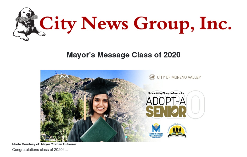 Coronavirus has caused the graduating Class of 2020 to have to do without a long-awaited traditional commencement ceremony. So the City of MoVal is partnering with Moreno Valley Unified and the Moreno Valley Education Foundation to show the community's support by helping residents recognize and celebrate grads through "Adopt-a-Senior."