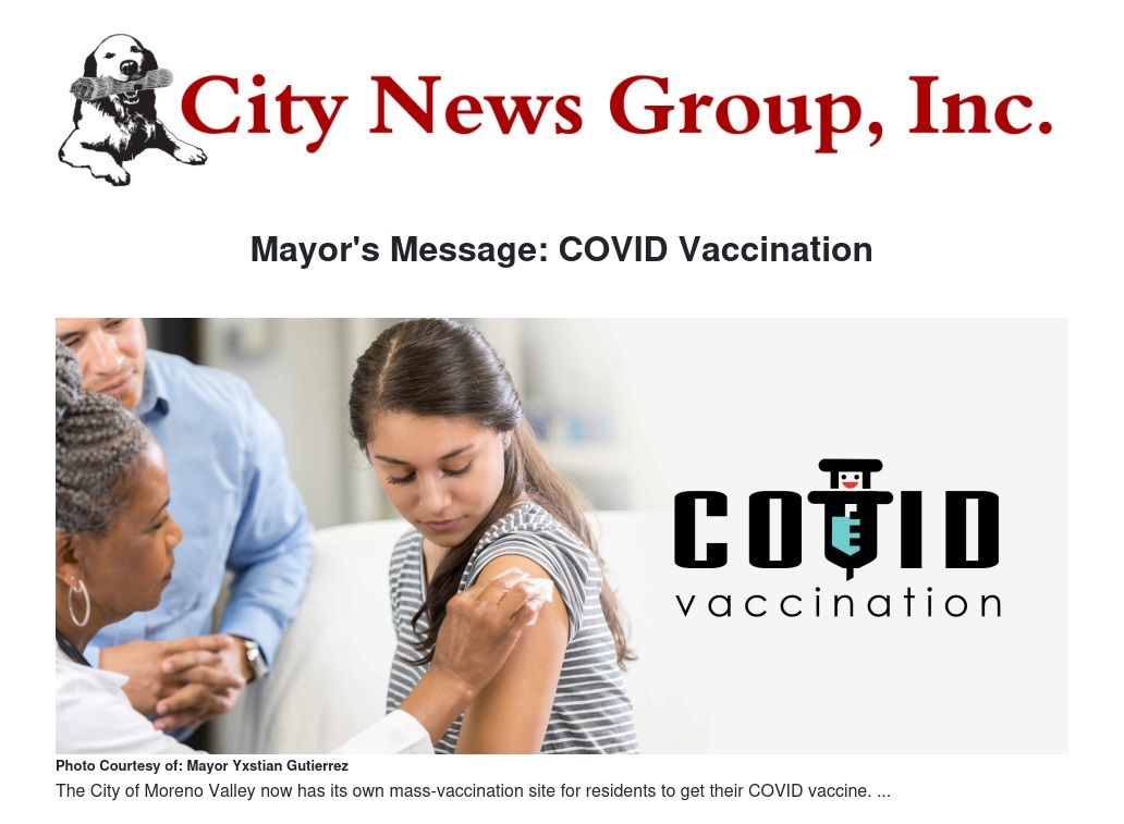 After weeks of working with Riverside County and advocating for a mass-vaccination site to be located in Moreno Valley, the City Council and I are pleased that the county finally opened one this week at the old Sears building at Moreno Valley Mall. You can find a comprehensive list of MoVal vaccine providers on the City’s website at www.moval.org/vaccine.