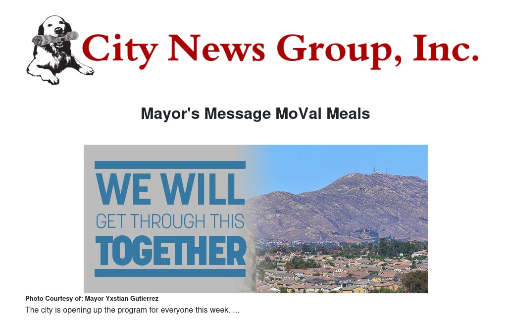 And this Friday, May 22, from 8:30 to 10:30 a.m. at the City's Conference & Recreation Center (CRC), we're partnering with the non-profit organization Feeding America to bring a food-distribution event to Moreno Valley open to anyone in need. Feeding America, an organization of more than 200 food banks nationwide, plans to serve 600-800 cars in a drive-thru fashion at the CRC parking lot. Each car will receive one emergency box full of shelf-stable items, which may contain soup, pasta, canned vegetables, beans, peanut butter, cereal, snacks, and, if available, fresh produce.