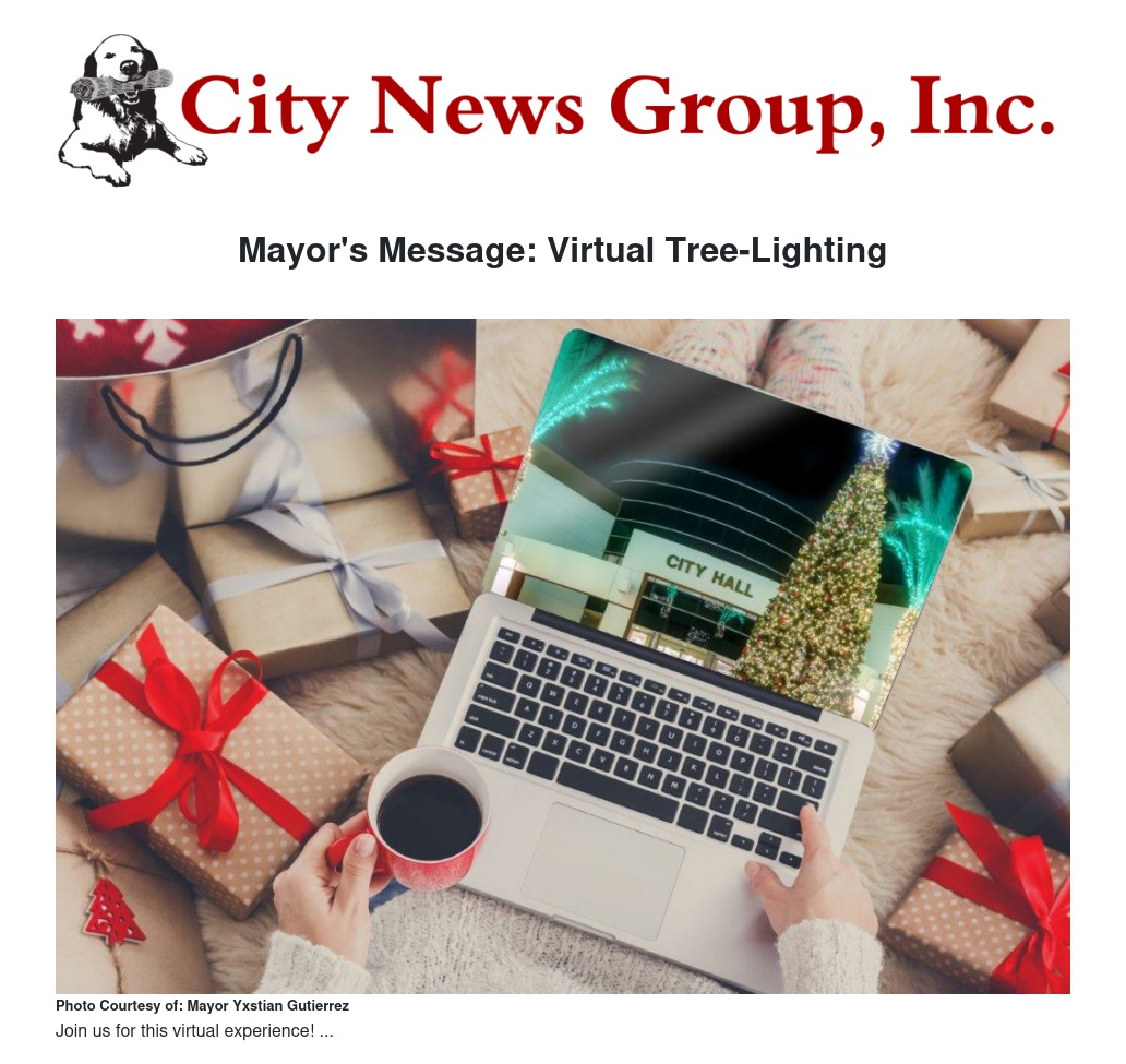 I hope you will join me this Saturday, Dec. 5, at 6 p.m. as we light the City’s beautiful holiday tree. For safety, we cannot gather a crowd. Instead, I will light the tree remotely, and you can watch the whole event online on Facebook and YouTube, and on cable channel MV3.