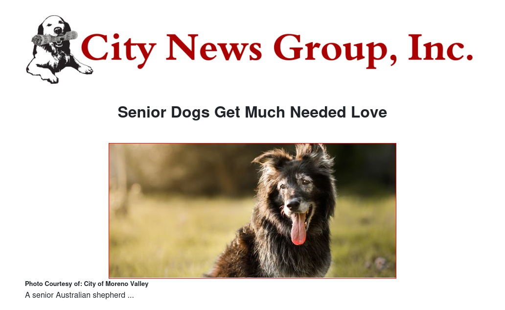 In an effort to boost the number of positive outcomes for senior dogs, the Moreno Valley Animal Shelter has launched the Lightning Lane Transfer Program in partnership with Haven Pet Center and sponsored in part by the Grey Muzzle Organization. Under the Lightning Lane Transfer Program, dogs seven years and older will receive treatment for all pre-existing medical conditions and be guaranteed a positive outcome, either through adoption at the Moreno Valley Animal Shelter or transfer to Haven Pet Center. Moreno Valley is able to launch this program with the help of a $15,000 grant from the Grey Muzzle Organization.