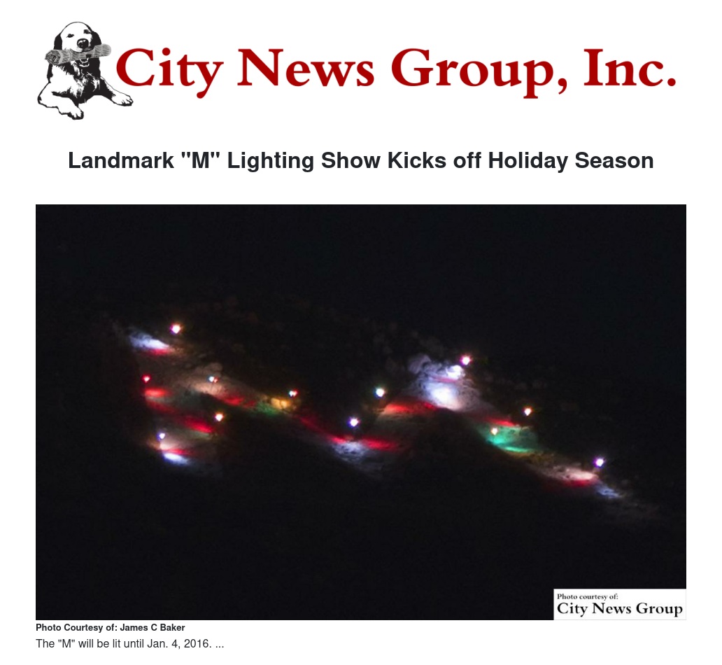 On Thursday, Dec. 3, the city's 31st anniversary, about 125 residents gathered at Towngate Memorial Park to witness the Official Annual Lighting of the Landmark "M", which lies on Box Springs Mountain, overlooking Moreno Valley.