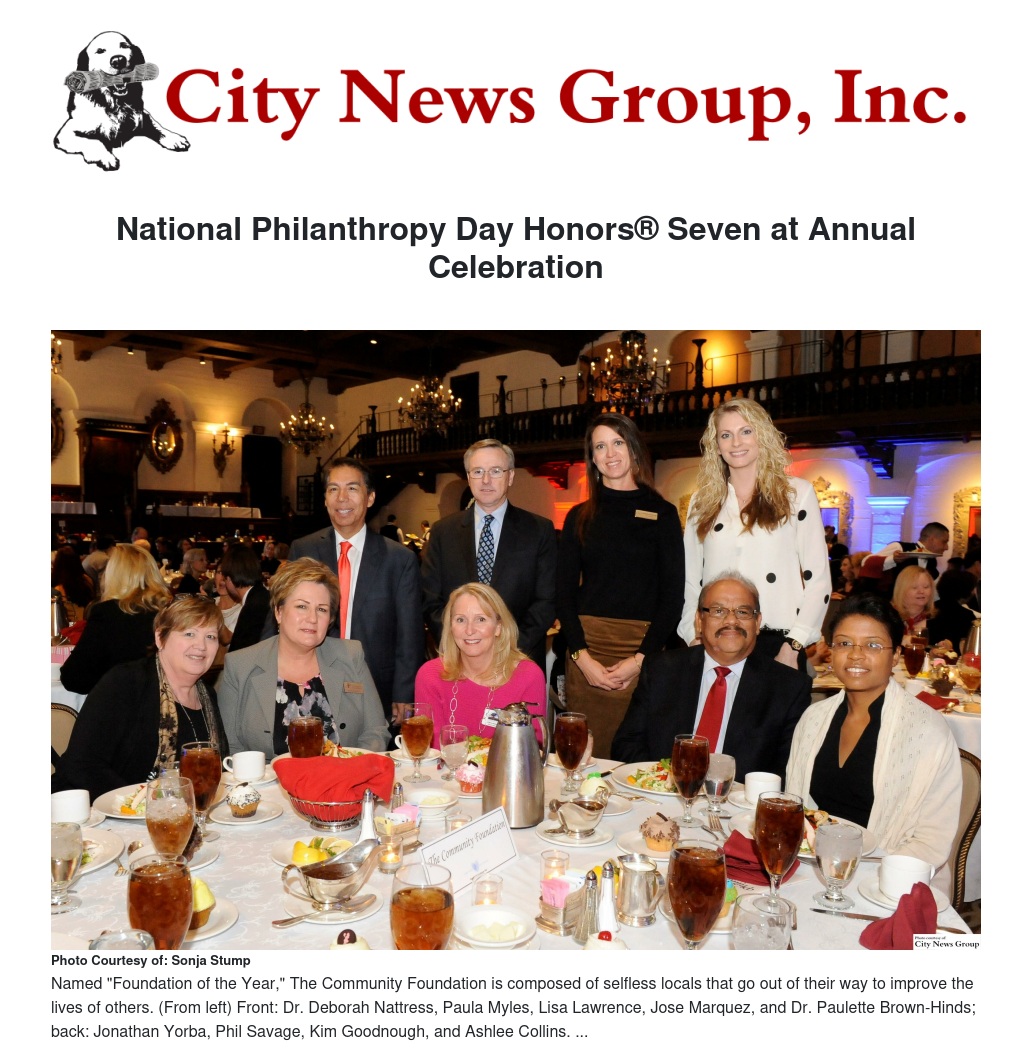 The event, held in recognition of National Philanthropy Day®, recognizes outstanding leadership and volunteerism throughout Riverside and San Bernardino Counties. National Philanthropy Day® occurs annually on the fifteenth of November and aims towards recognizing the contributions of philanthropy - and those people active in the philanthropic community - to the enrichment of our world.