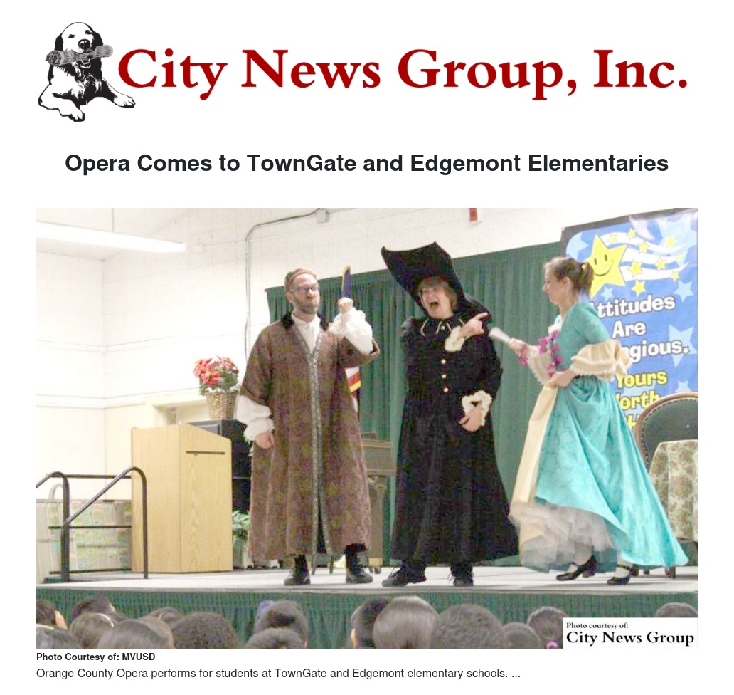 Baritone, bass, tenor - these are not the kind of voices usually heard in elementary school multi-purpose rooms, but for several magical hours at several assemblies this week, students at TownGate and Edgemont elementary schools soaked it all in and absolutely LOVED it as members of Orange County Opera performed selections from Rossini's comedic opera, "The Barber of Seville."