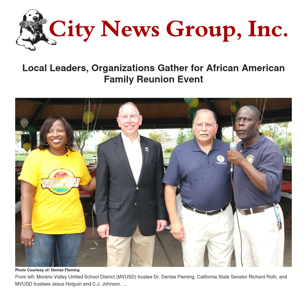 More than 500 Moreno Valley residents and approximately 50 vendors recently attended the First Annual African American Family Reunion event in Celebration Park hosted by the African American Caucus, Region 13. The purpose of the event was to impact, educate and empower the community with available resources. The NAACP, Tuskegee Airmen, Riverside Mental Health, Salvation Army, Riverside County Sheriff’s Department and many other vendors encouraged the community to get out and vote, and participate in education and legislative events.
