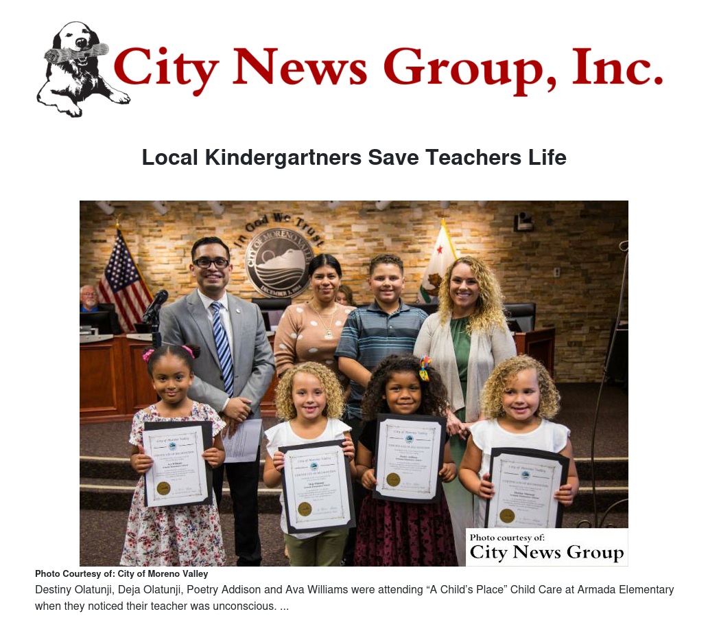MORENO VALLEY>> On May 16, the City Council recognized four kindergarten students whose courageous actions and ability to keep calm helped their teacher who was suffering a medical emergency get the emergency aid that she needed.