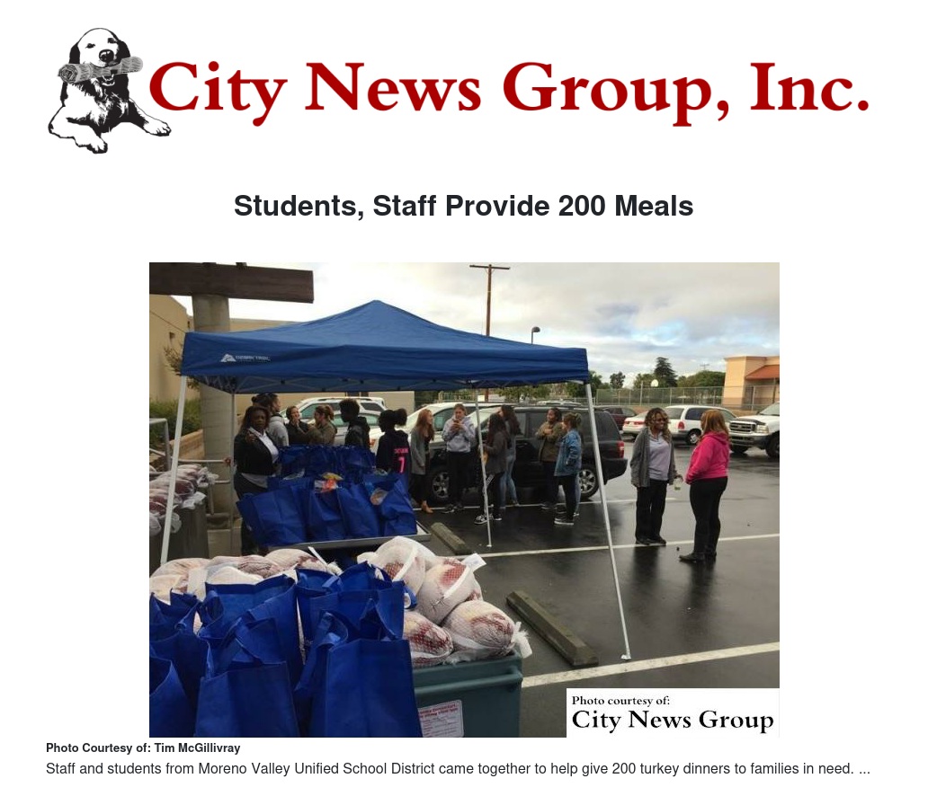 During the Thanksgiving holiday, staff and students from Moreno Valley Unified School District came together to help support the hungry and homeless.