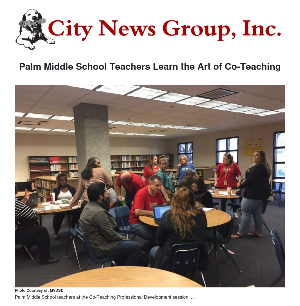 The Palm Middle School certificated team participated in the first Art of Co-Teaching professional development session hosted by the MVUSD Professional Development Specialist team. During the session, teachers discussed differences between the collaborative and co-teaching models. Professional Development Specialists Mary Stafford, Joanne Katona, Antoinette Saldana, Jill Dayton and Stacey Lerma, along with Program Specialist Rosemary Nirschl, provided interactive lessons that connected to all core curriculum areas.
