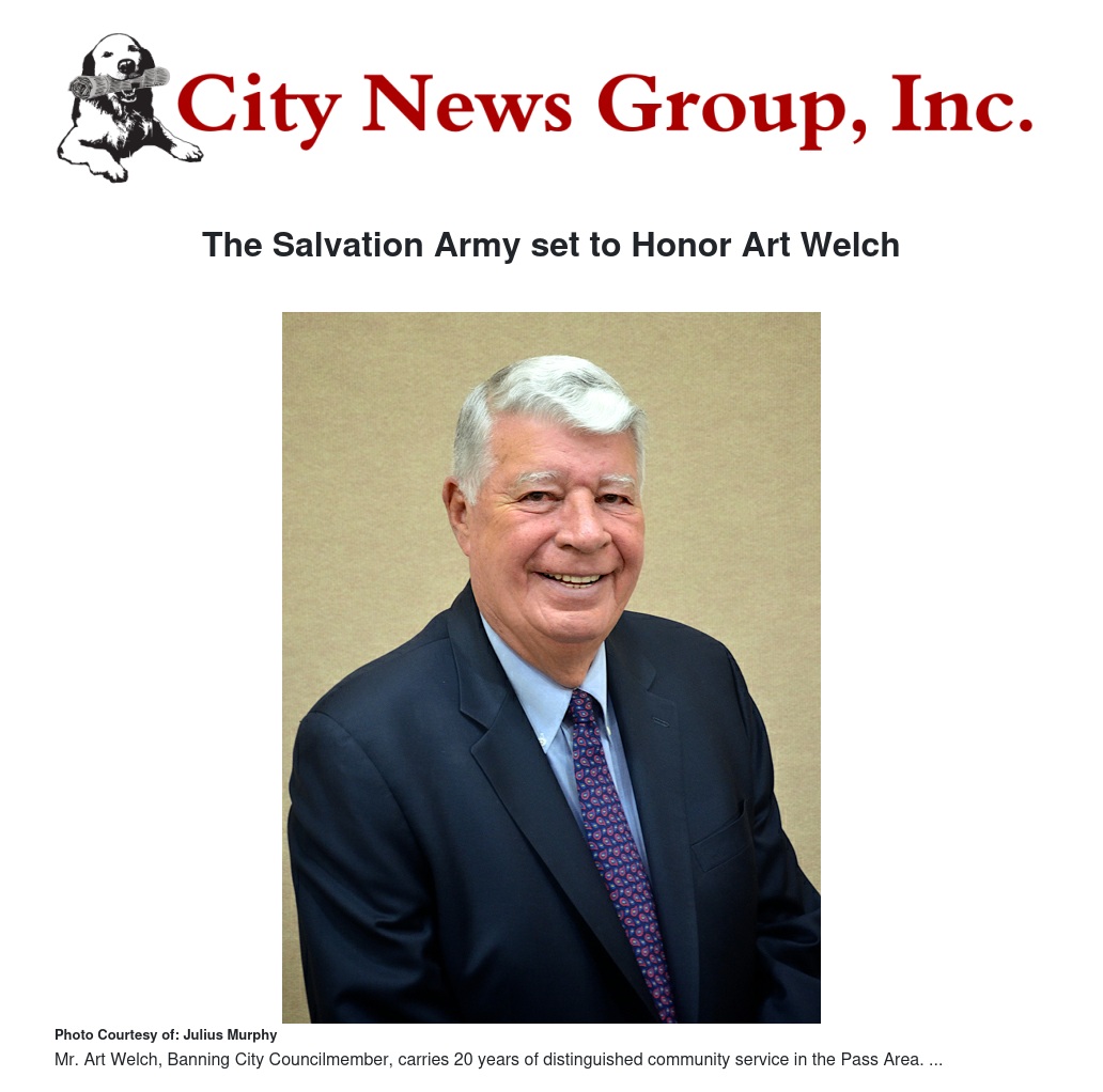 The event will honor Mr. Art Welch, Banning City Councilmember, for 20 years of distinguished community service in the Pass Area. Throughout his years in the San Gorgonio Pass Area Welch has been actively involved in both civic and governmental affairs. He currently serves on various boards and committees that aim to enhance the quality of life in his community. Additionally, in 2012 he was instrumental in bringing The Salvation Army’s programs and services to the Pass Area.