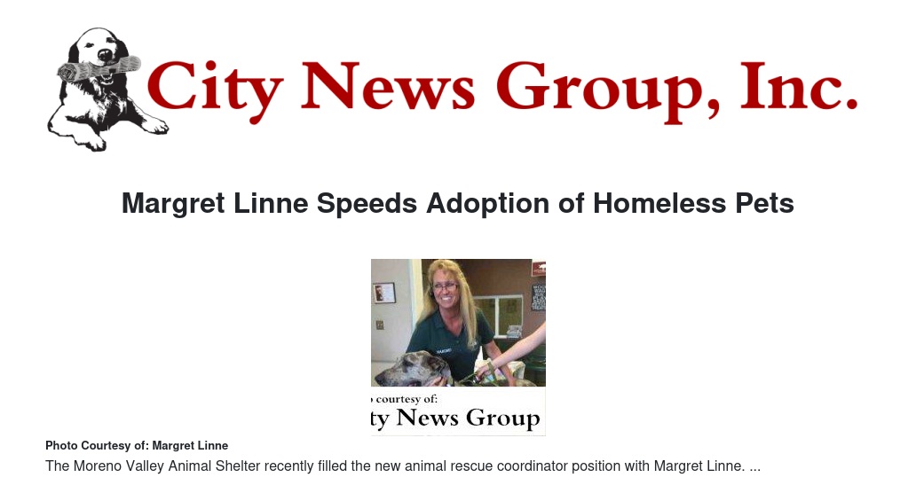 MORENO VALLEY >> In an ongoing effort to speed adoption of homeless pets, the Moreno Valley Animal Shelter recently hired Margret Linne as its first Animal Rescue Coordinator.