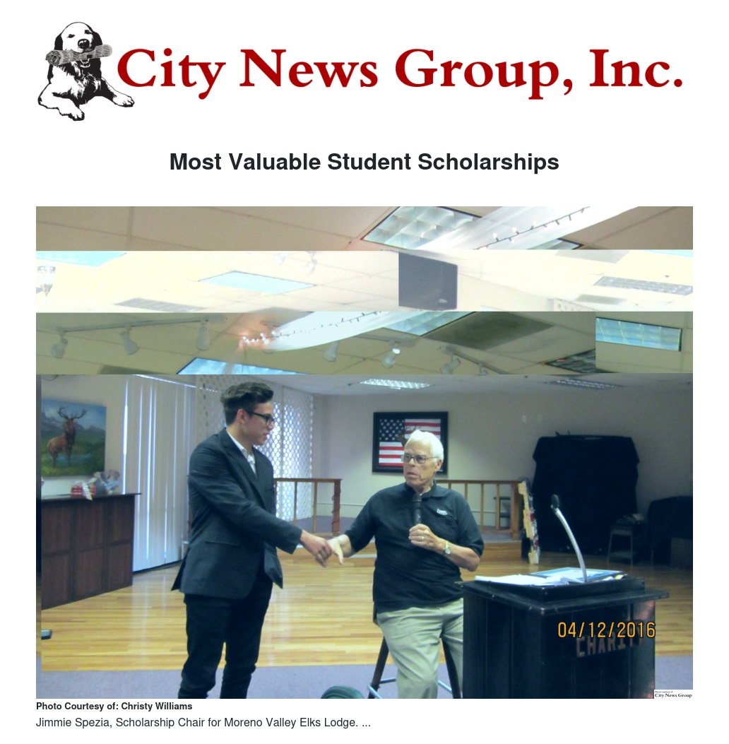 MORENO VALLEY >> On April 5, 2016, Elks Lodge #2697 honored six Lodge Most Valuable Student Scholarship Winners with a pasta dinner, trimmings, and dessert.