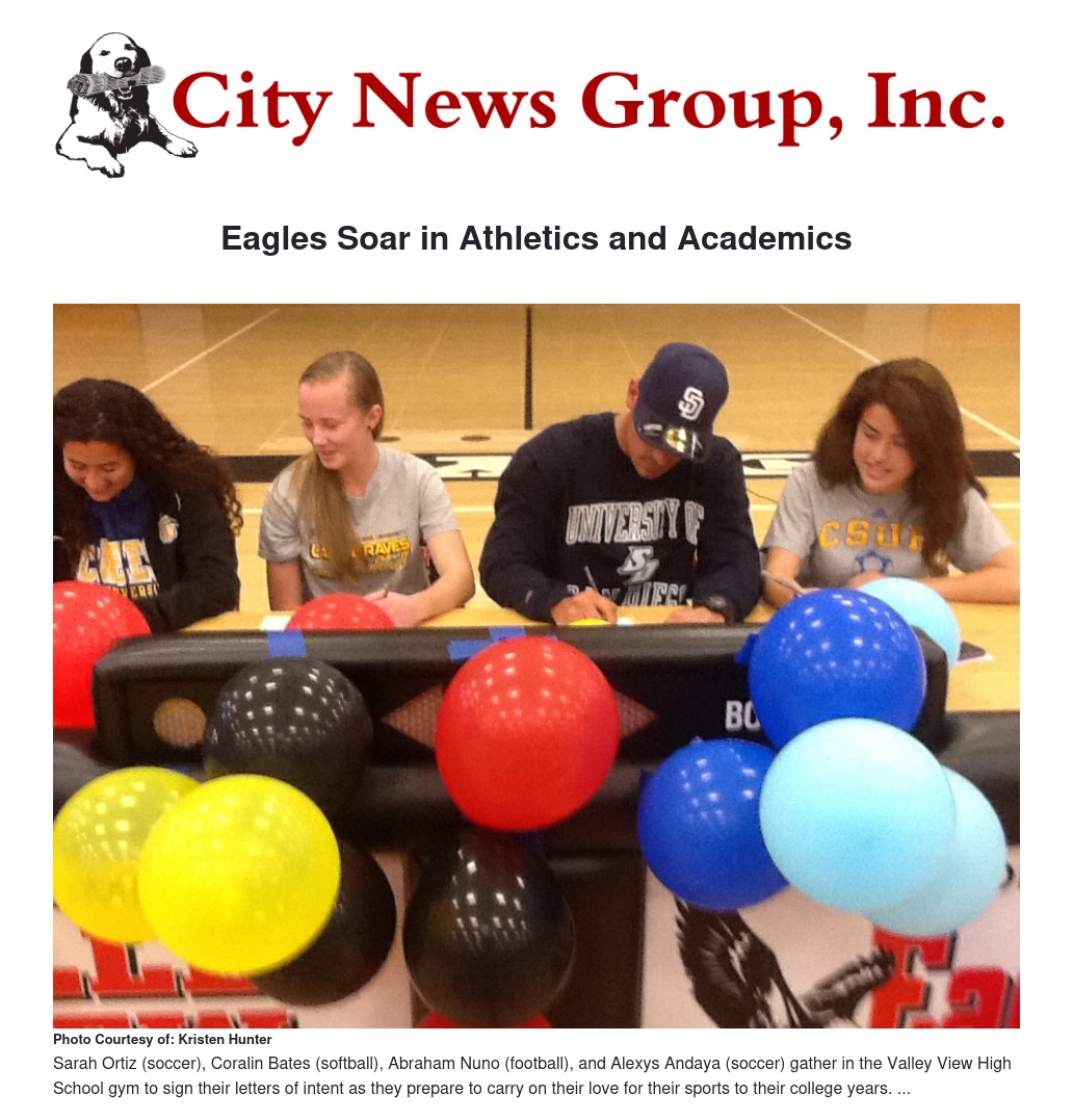 Joining them in the collegiate level are soccer player Sarah Ortiz who will be going to McNeese State in Lousiana, teammate Alexys Andaya who is headed to Cal State Bakersfield, softball player Coralin Bates who will attend Ottawa University in Kansas, and football quarterback Abraham Nuno who will play at the University of San Diego.