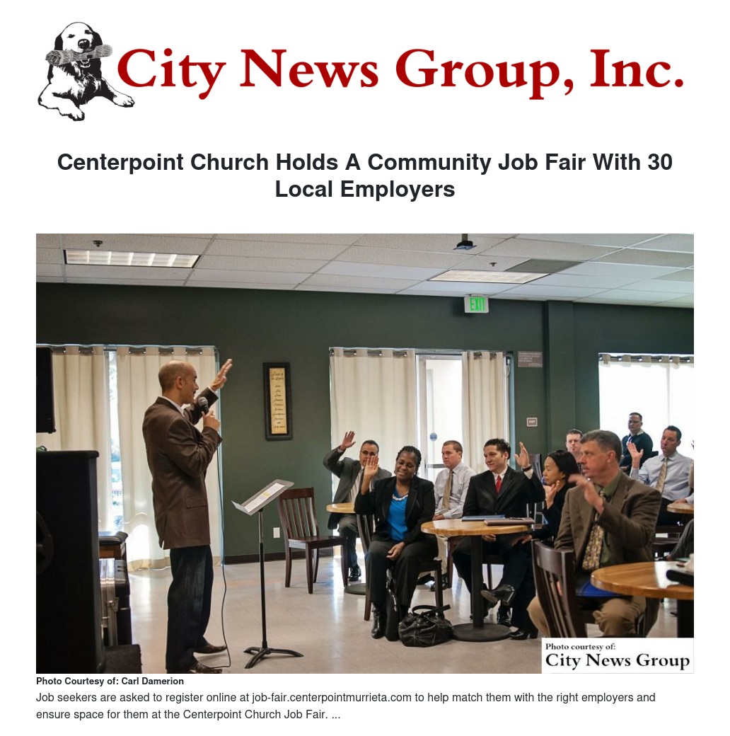 Job seekers are asked to register online at www.job-fair.centerpointmurrieta.com to help match them with the right employers and ensure space for them at the Centerpoint Church Job Fair.