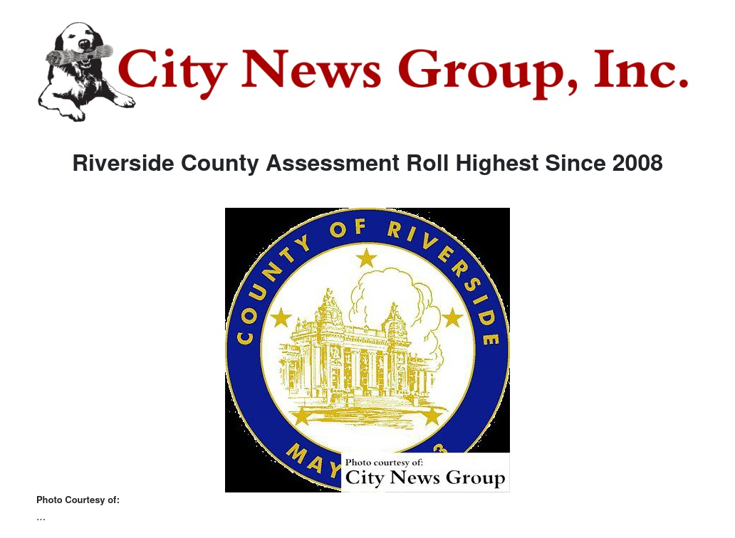 Beginning in mid-July, Riverside County property owners will be able to view their 2015-16 roll value online at www.riversideacr.com. Properties can be searched by address or parcel number. (The attached file includes a full report on assessed values in cities and unincorporated areas, as well as historic data on assessed values in Riverside County.)