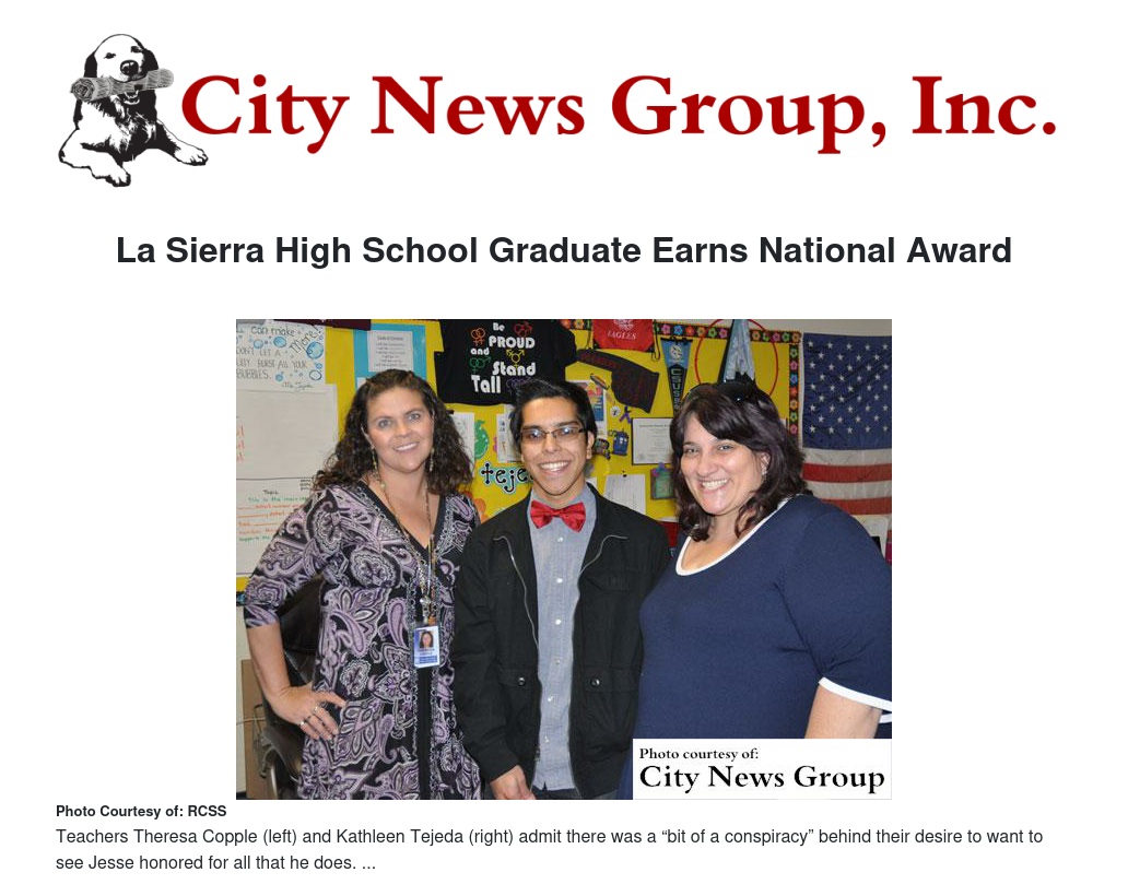 After watching Jesse grow and flourish at La Sierra High School, Copple and Tejeda decided to nominate Jesse for the statewide “Yes I Can” Award from the Council for Exceptional Children (CEC) without telling him. In late 2014, Jesse was recognized by the Alvord Unified School District for being selected as one of the statewide winners. In early 2015, Jesse received word that he would be one of 21 students to receive the national “Yes I Can” Award from the CEC.