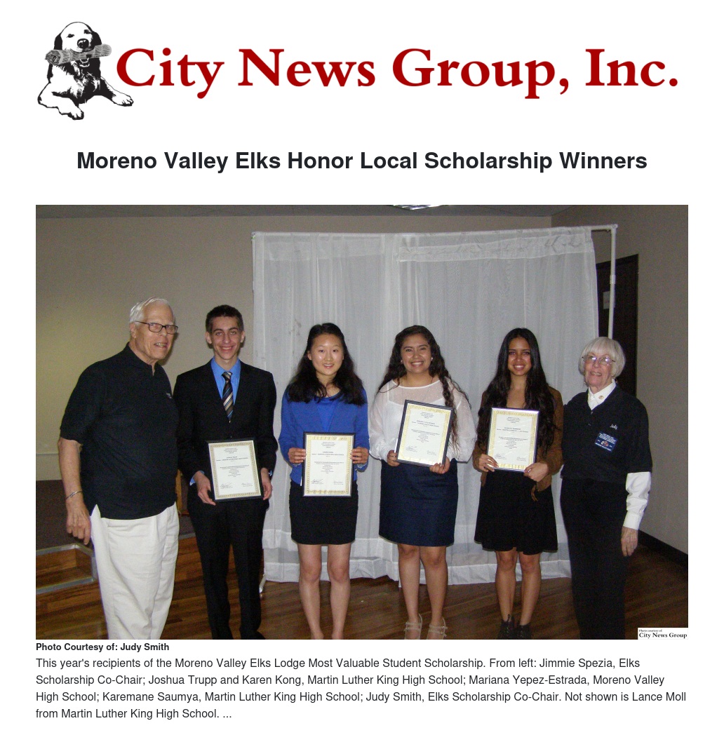 Late last month, the Moreno Valley Elks honored their Most Valuable Student Scholarship Lodge winners with an awards dinner and program.