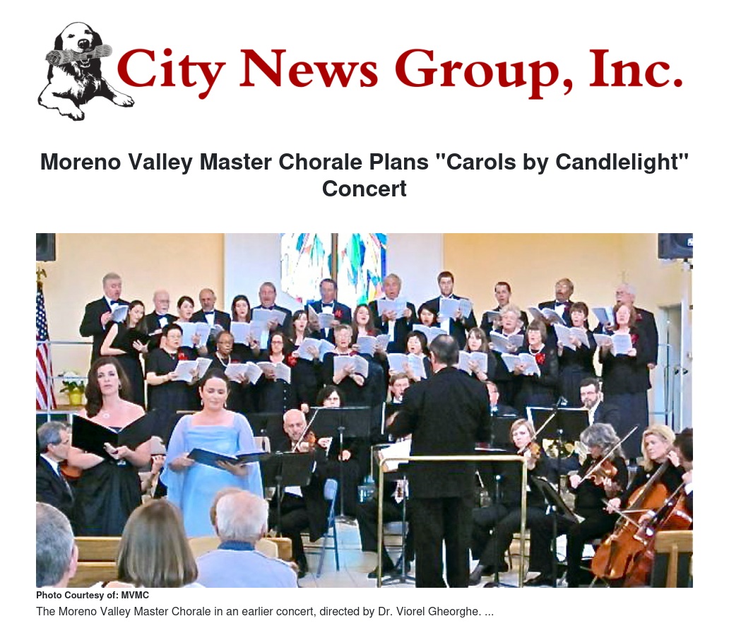 On Sunday, Dec. 14 at 4 p.m., Moreno Valley Master Chorale and Orchestra, under the direction of Dr. Viorel Gheorghe, will present a “Carols by Candlelight” concert at the Shepherd of the Valley Lutheran Church located at 11650 Perris Blvd., north of Ironwood in Moreno Valley.