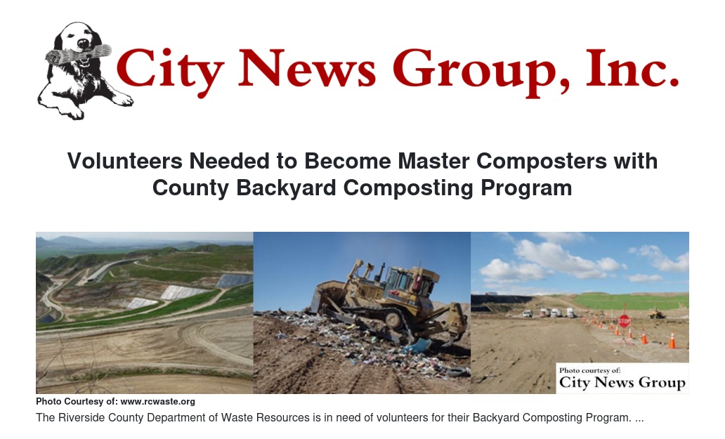 The Riverside County Department of Waste Resources is seeking volunteers to help with the backyard composting program. Volunteers will attend a training course for eight Tuesdays and will then donate 40 hours back to the program. Volunteers are needed to staff Saturday morning workshops, classroom presentations, community group presentations and to do outreach.