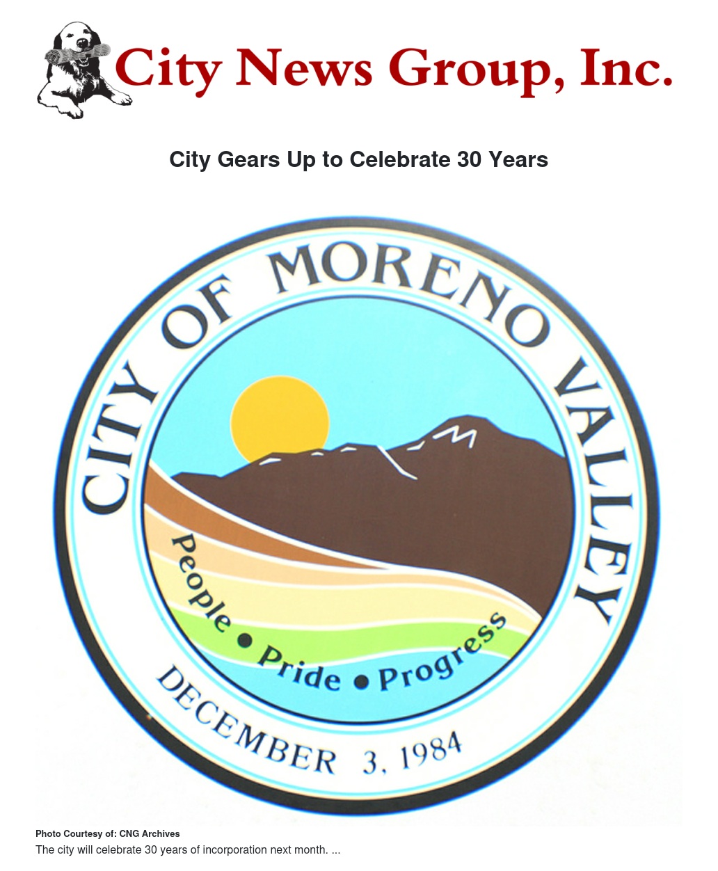A small celebration commemorating three decades of the city's incorporation is scheduled in Moreno Valley early next month.
