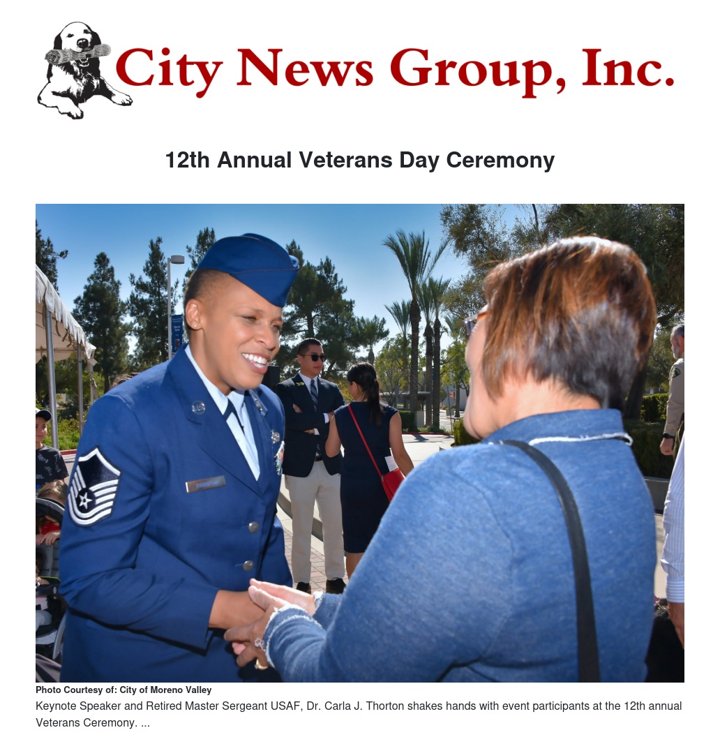 Mayor Gutierrz was also present to provide his thanks to both the veterans and their families. Many esteemed guest, including previous veterans from both WWII and from the Vietnam War were present during this event as well. One such guest being City Councilwoman Dr. Carla J. Thorton, who held a both humorous and inspiring keynote address. Dr. Thorton is a retired Master Sergeant of the United Sates Airforce and is a 20-year veteran herself. The event was held publicly at the City of Moreno Valley Veterans Memorial.