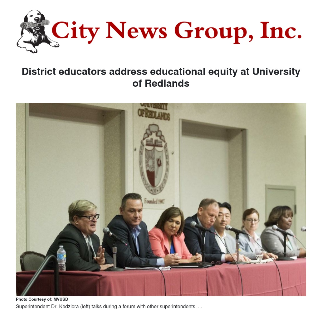 Superintendent Dr. Martinrex Kedziora participated in a forum with other Inland Empire superintendents and Riverside County Superintendent Dr. Judy White. The forum covered a variety of topics that focused on equality and equity across all student groups. Board of Education member, Jesús M. Holguín also attended and gave a welcome to the institute participants.