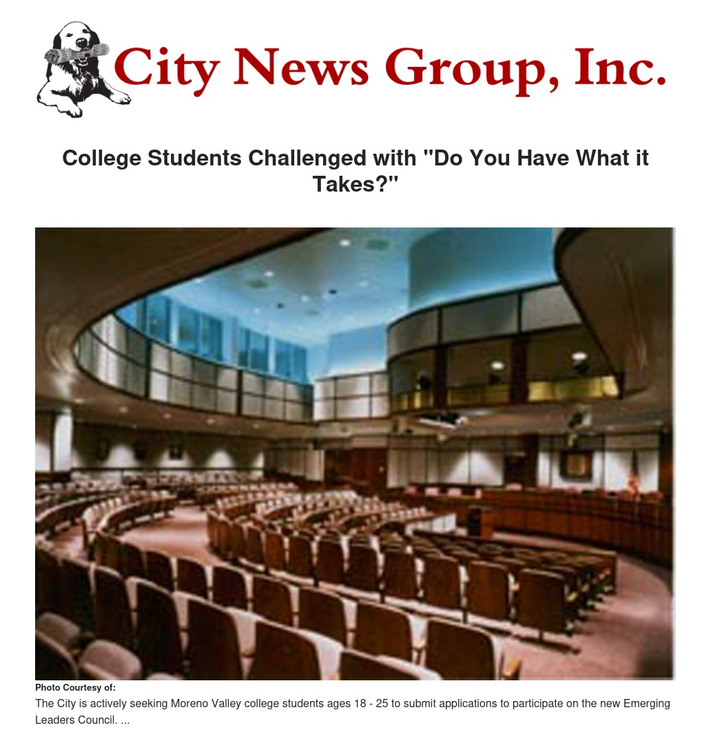 The City of Moreno Valley is actively seeking Moreno Valley college students ages 18 - 25 to submit applications to participate on the new Emerging Leaders Council.