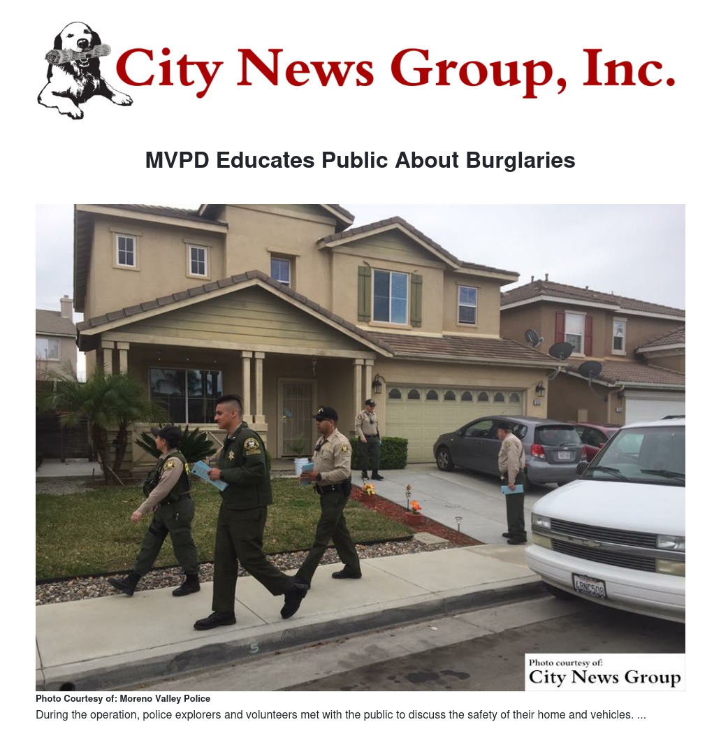 During the operation, police explorers and volunteers met with the public to discuss the safety of their home and vehicles. The Moreno Valley Police Department distributed more than 500 informational pamphlets directed toward decreasing the chances of being victimized.