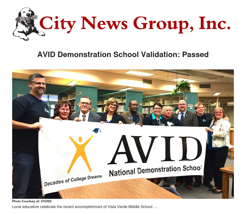 After a validation process held at the school site on Tuesday, February 25, 2014, Vista Verde Middle School became the first Middle School in the Val Verde Unified School District to become an AVID Demonstration School.