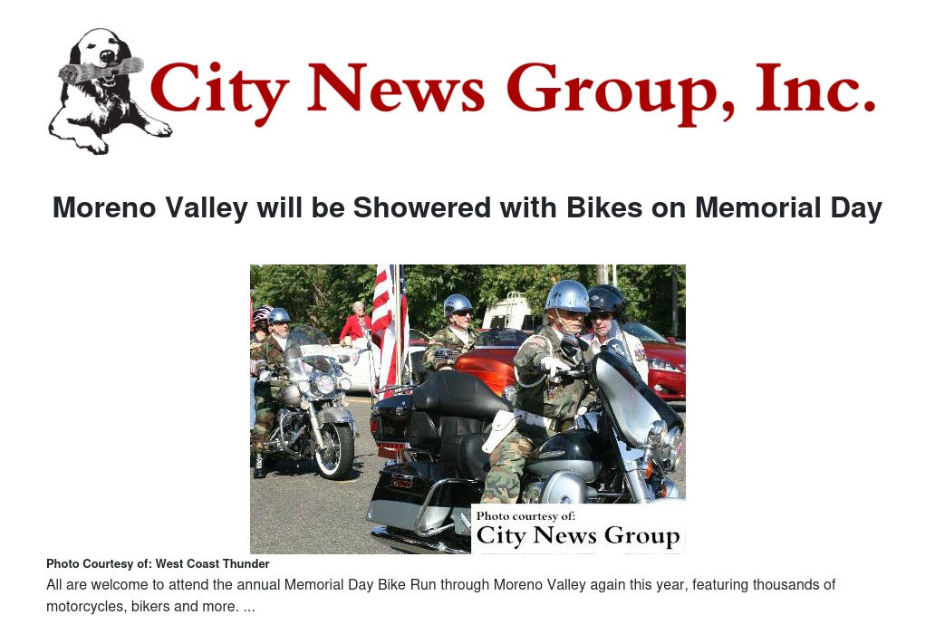 The City of Moreno Valley has announced that the annual West Coast Thunder (WCT) Memorial Day Bike Run/ Parade will continue to include Moreno Valley's Sunnymead Boulevard on Monday, May 25.