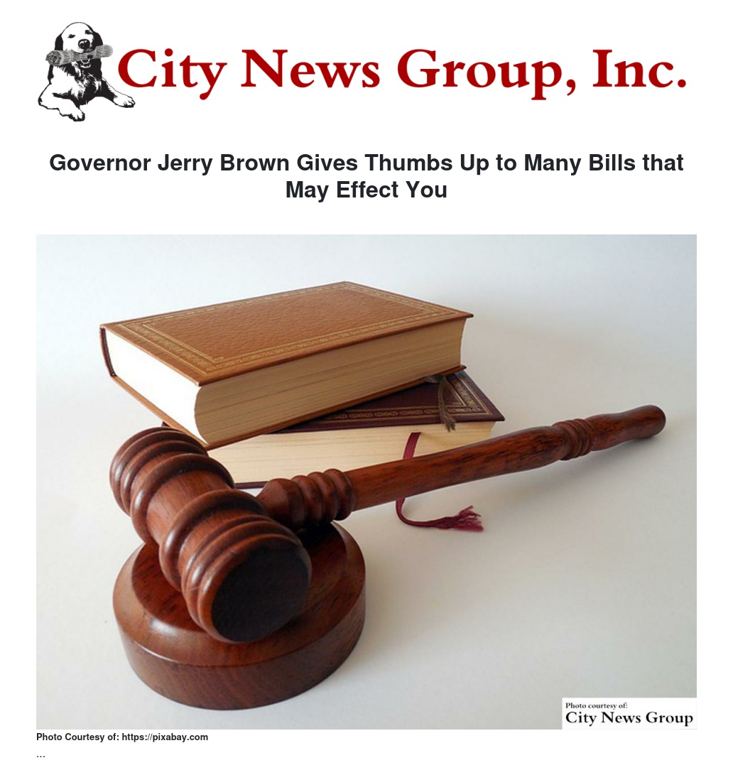 Governor Jerry Brown recently gave the thumbs up to a myriad of bills in the past weeks of this month. Many of these bills will affect all of us, either immensely or hardly at all. Either way, it’s a good idea to stay up to speed about some instrumental factors that can change the way we live in California.