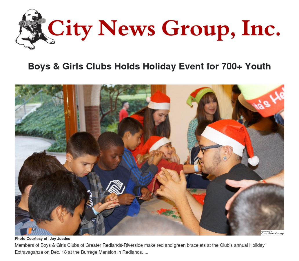 More than 700 young people received gifts and met Santa Claus at the Boys & Girls Clubs of Greater Redlands-Riverside’s annual Holiday Extravaganza at the Burrage Mansion on Friday, Dec. 18.