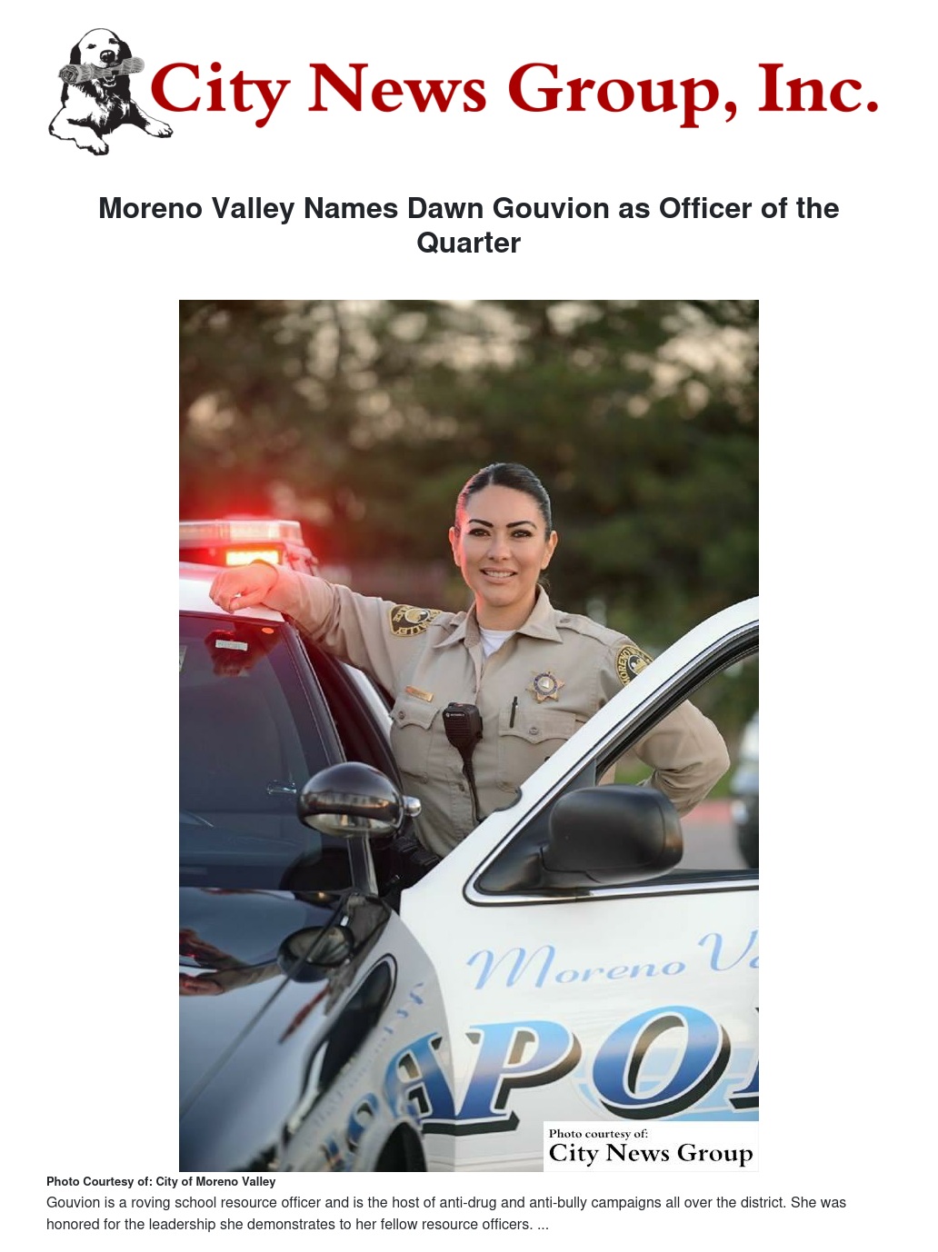 MORENO VALLEY>> The City of Moreno Valley has recently named police officer Dawn Gouvion as Police Officer of the Quarter, for the fourth quarter of 2016.