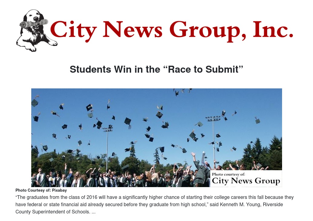 “The graduates from the class of 2016 will have a significantly higher chance of starting their college careers this fall because they have federal or state financial aid already secured before they graduate from high school,” said Kenneth M. Young, Riverside County Superintendent of Schools. “Race to Submit has elicited a school-wide commitment that includes counselors, teachers, classified staff, and administrators that should also be replicated in the larger community. The commitment to push the sense of urgency related to financial aid extends far beyond the school campus and our hope is that mayors, city council members, and business leaders in the community can see the direct connection to economic prosperity that comes with a more educated population.”