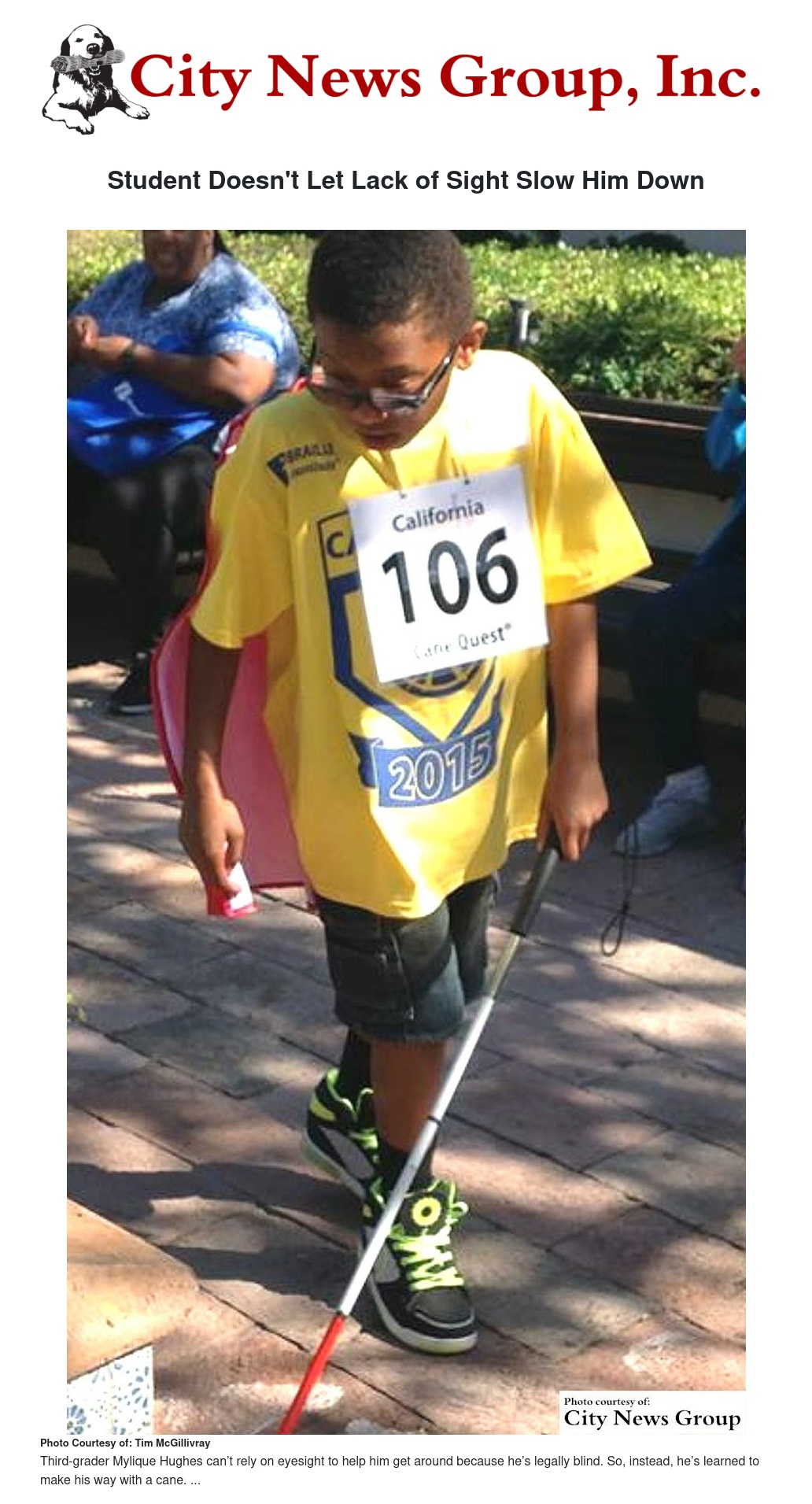 Instead, he has learned to make his way with a cane. Recently, Mylique demonstrated his learning by taking part in Cane Quest, a national orientation and mobility program of the Braille Institute of America held in Anaheim.
