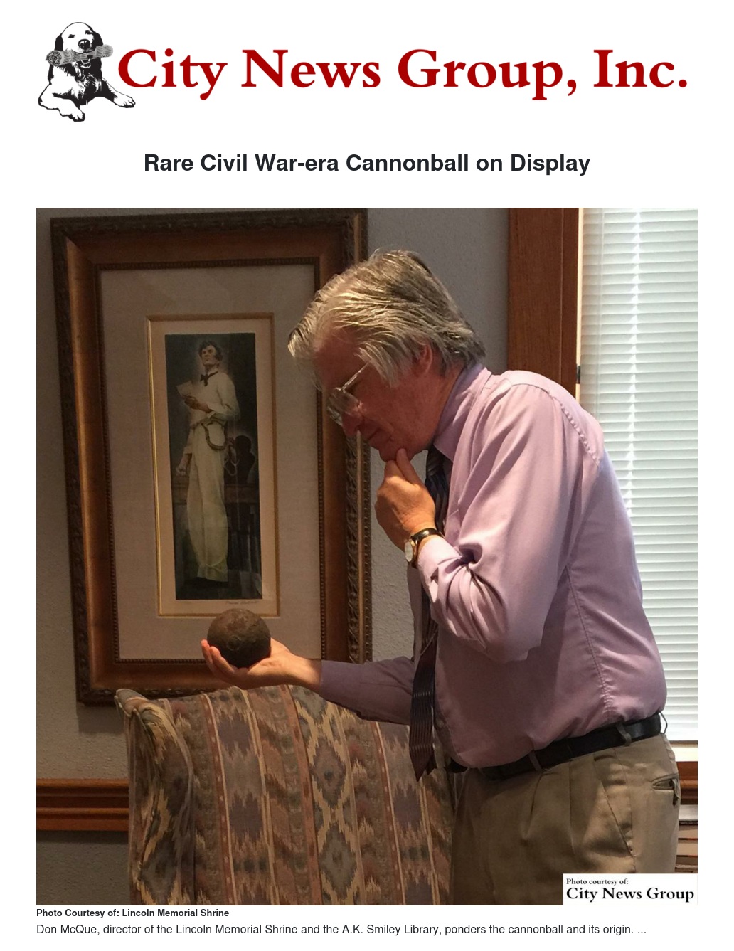 Don McQue, director of the Lincoln Memorial Shrine and the A.K. Smiley Library, will be leading research on the cannonball alongside A.K. Smiley Library Archivist Maria Castillo.