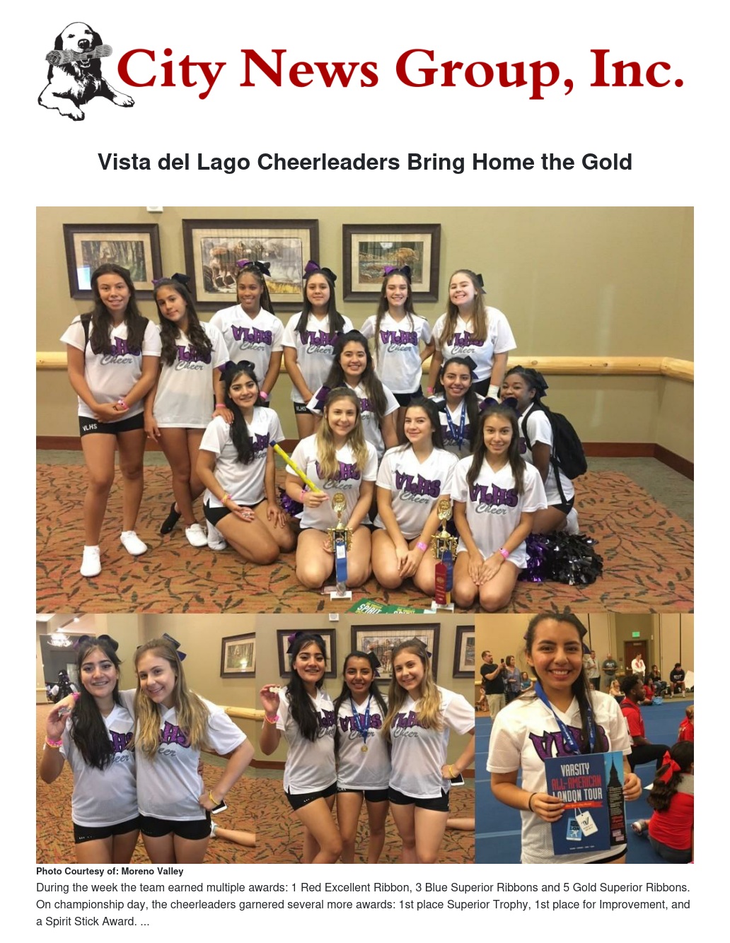 MORENO VALLEY>> The Vista del Lago cheerleading team is off to a spirited start for the upcoming school year! Recently, a group of mostly first-timers attended a Universal Cheerleading Association camp in Garden Grove and returned to Vista with some hardware! The team spent a week of intense training and learning new techniques. During the week the team earned multiple awards: 1 Red Excellent Ribbon, 3 Blue Superior Ribbons and 5 Gold Superior Ribbons. On championship day, the cheerleaders garnered several more awards: 1st place Superior Trophy, 1st place for Improvement, and a Spirit Stick Award.