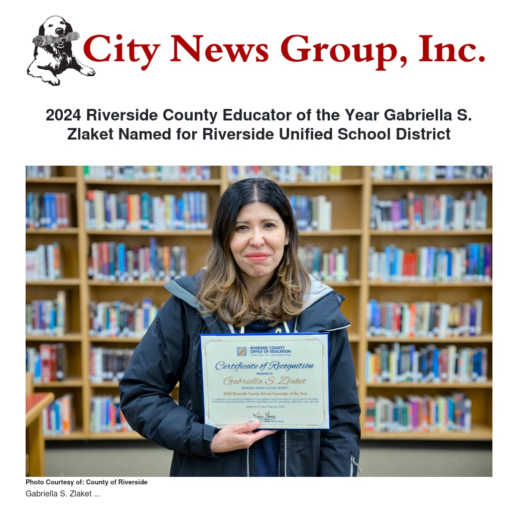 It would be difficult to identify a better way to celebrate National School Counseling Week than being named the 2024 Riverside County School Counselor of the Year. That was the reality today for Arlington High School counselor, Gabriella S. Zlaket. Surrounded by her family, colleagues, and school and district staff, Mrs. Zlaket was surprised with the news that she had been named the first 2024 Riverside County Educator of the Year by Riverside County Superintendent of Schools, Dr. Edwin Gomez.