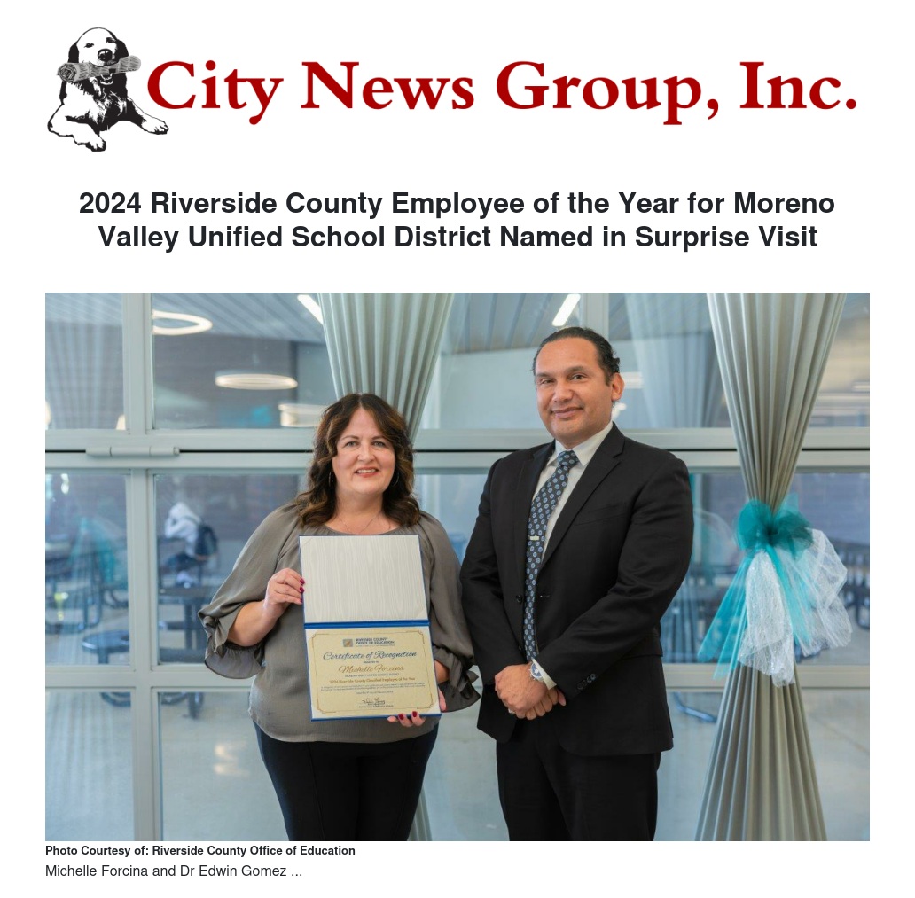“What a huge surprise, and I am so honored and so happy to be a part of Moreno Valley Unified School District,” said Michelle Forcina after being named the 2024 Classified Employee of the Year. “I love all of you, my students out there, and the staff that is so supportive. I’m so grateful for all of you, and I am looking forward to many more years with all of you.”