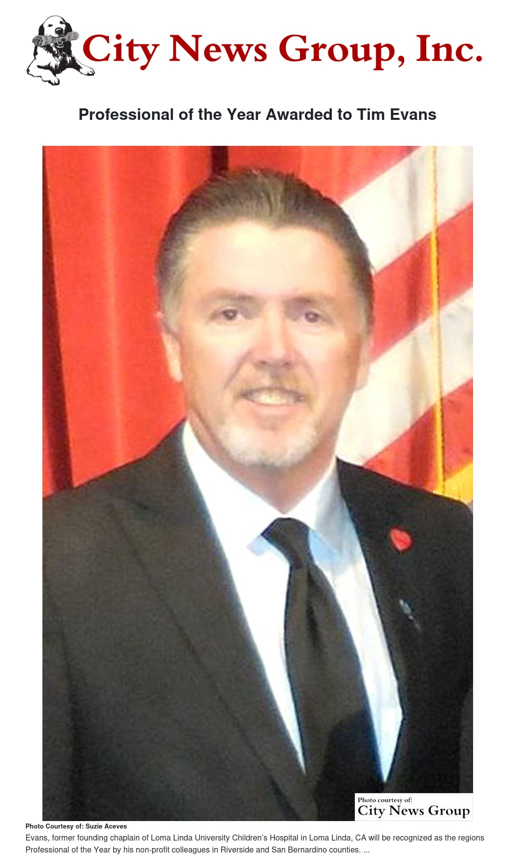 Evans, former founding chaplain of Loma Linda University Children’s Hospital in Loma Linda, will be recognized as the regions Professional of the Year by his non-profit colleagues in Riverside and San Bernardino counties.