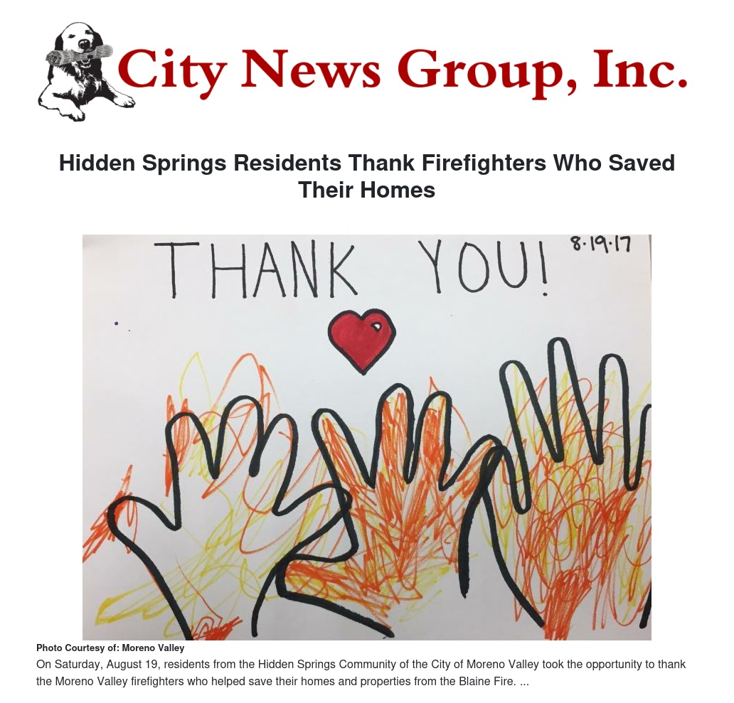 On Saturday, August 19, residents from the Hidden Springs Community of the City of Moreno Valley took the opportunity to thank the Moreno Valley firefighters who helped save their homes and properties from the Blaine Fire.