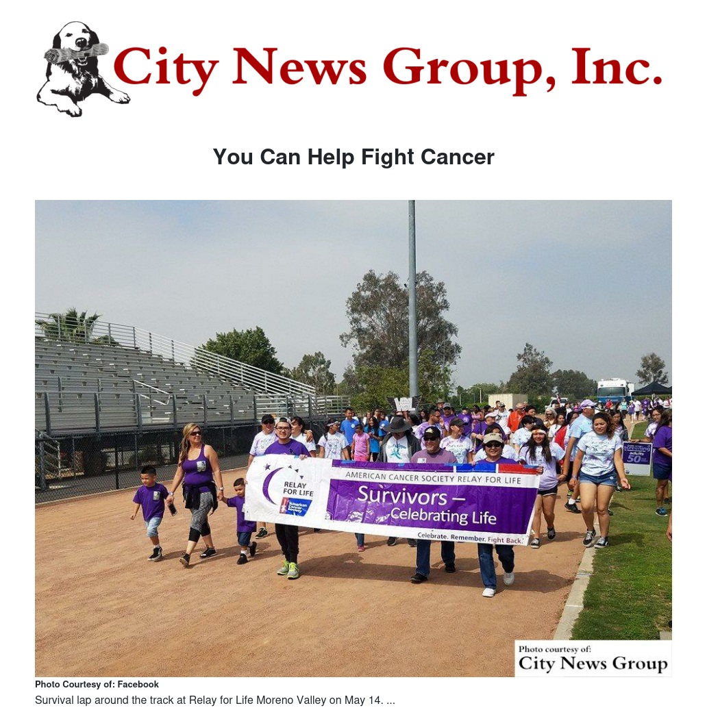 Another Relay for Life event will take place at Colton High School on Saturday, May 21. To learn more or to register, please visit www.relayforlife.org/ColtonCA. You can also reach out to Yvonne England at 951.300.1232 or at yvonne.england@cancer.org.