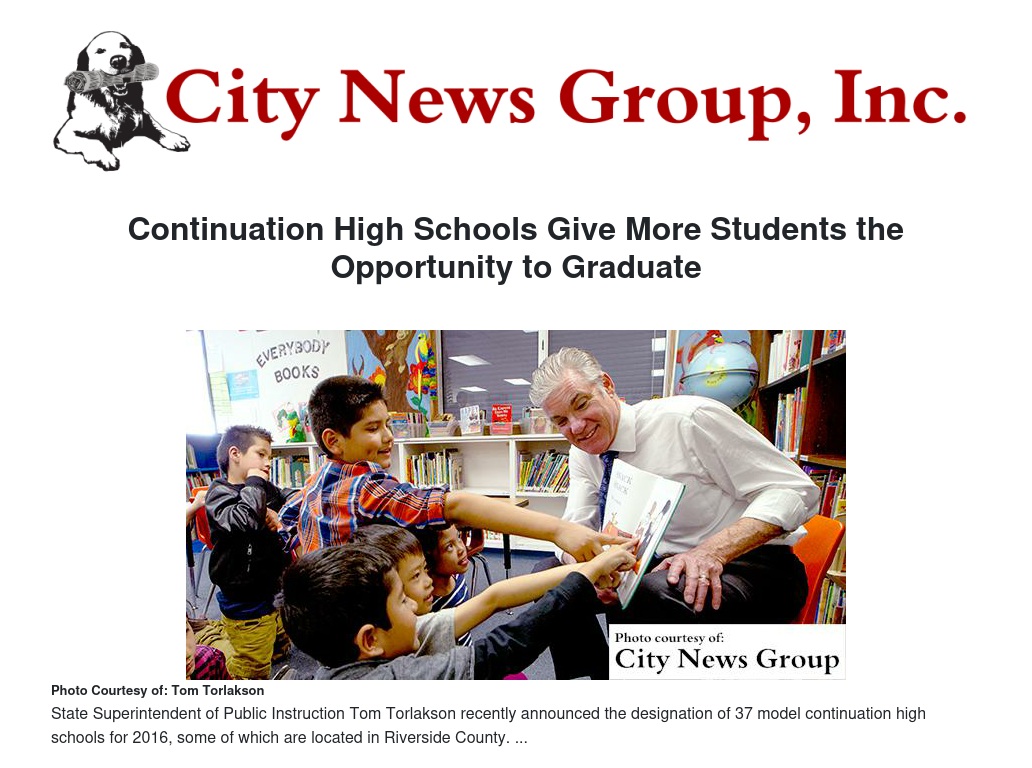 MORENO VALLEY >> State Superintendent of Public Instruction Tom Torlakson recently announced the designation of 37 model continuation high schools for 2016. These schools, some of which are located in Riverside County, are being recognized for their innovative teaching approaches that enable students with diverse needs to complete their high school education.