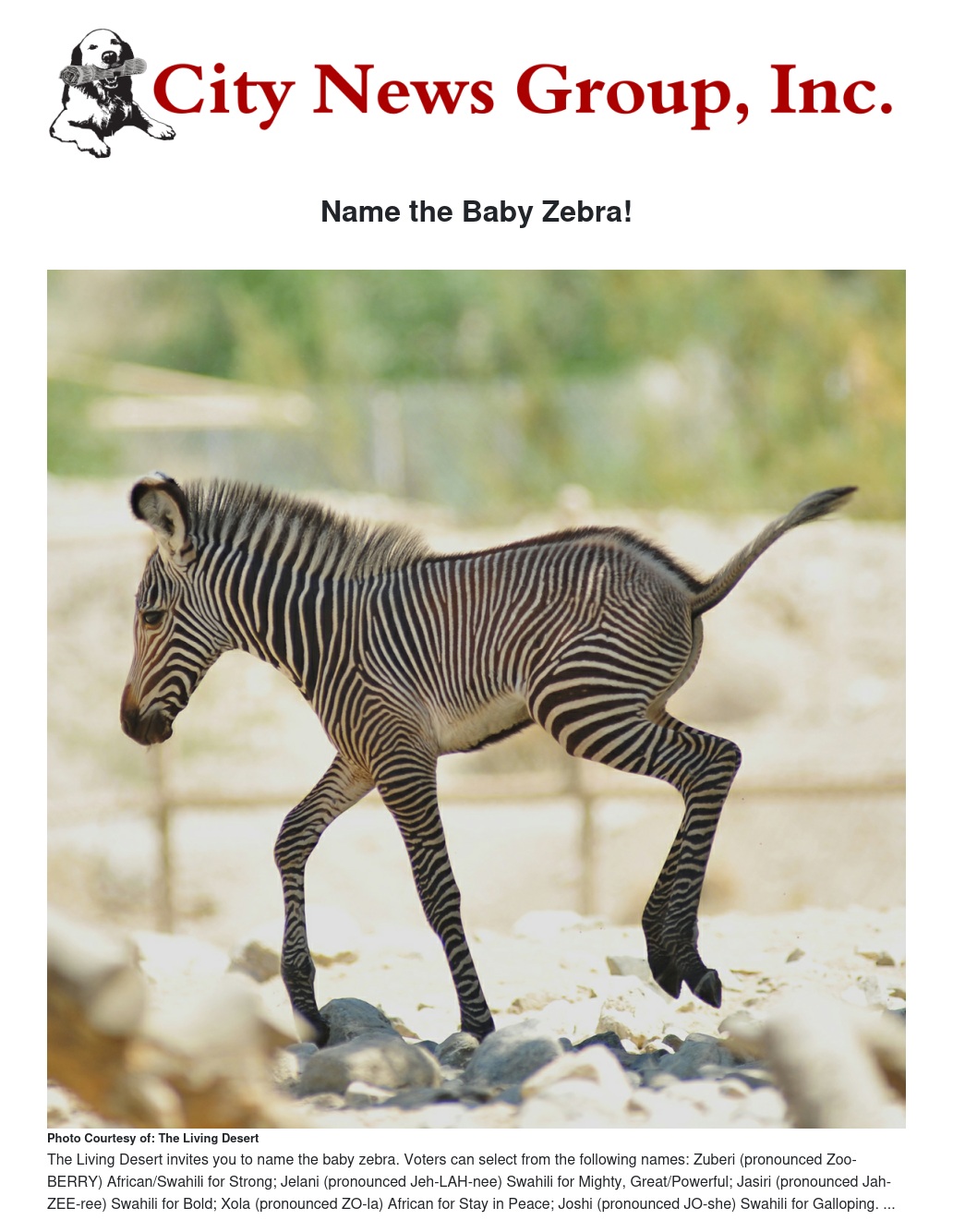 Visitors to The Living Desert are eligible to vote on the name for the male zebra foal that was born at the zoo on May 30th.