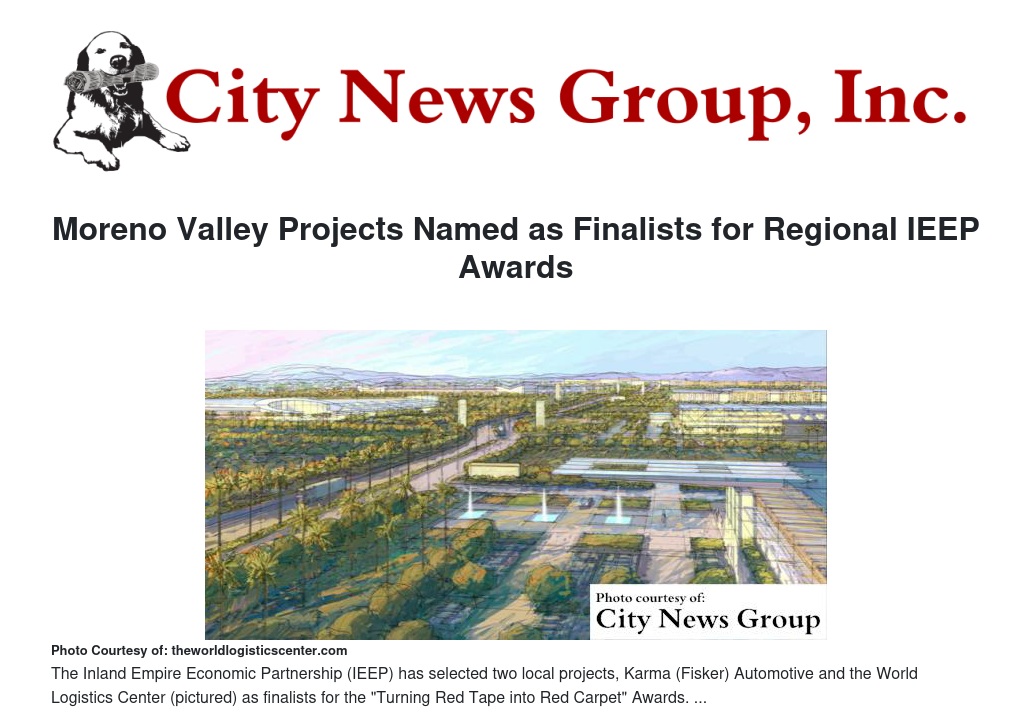 IEEP has recognized the City's success in partnering with federal, state and regional agencies, along with the private sector to bring auto manufacturing back to Southern California with the Karma (Fisker) Automotive project in the Public-Private Partnerships category. The World Logistics Center Specific Plan is a finalist in the Real Estate Reuse and Redevelopment category as the largest planned industrial development in California's history.