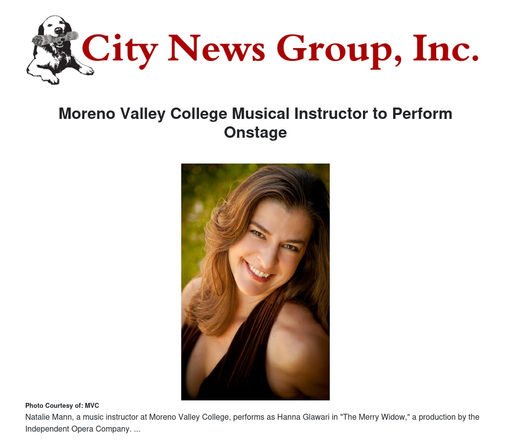 Moreno Valley College music instructor Natalie Mann will play Hanna Glawari in the Independent Opera Company's The Merry Widow. The first of four performances was held Jan. 18 at St. Andrew's Lutheran Church, 11555 National Blvd., Los Angeles. 90064. Sequential showings included Jan. 19 as well and shows on Jan. 25, at 7 p.m. and Jan. 26 at 4 p.m.