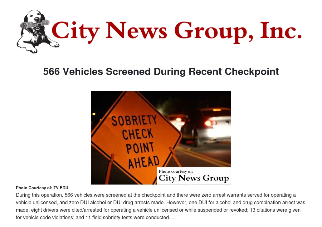 DUI/Driver’s License checkpoints have been shown to lower DUI deaths and injuries. A major component of these checkpoints are the deterrent effects it has on those who might drive drunk or drugged impaired, bringing about more awareness and encouraging everyone to use sober designated drivers.