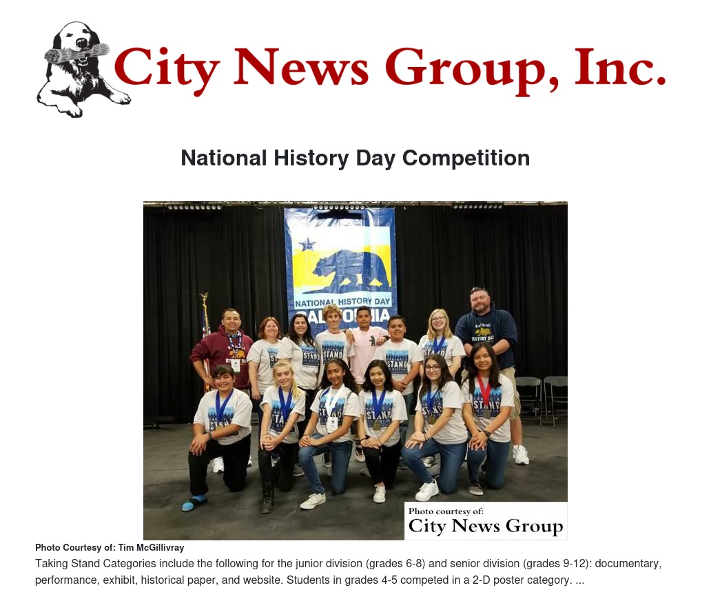 National History Day-California state champions are as follows (all advance to national competition unless otherwise noted):
