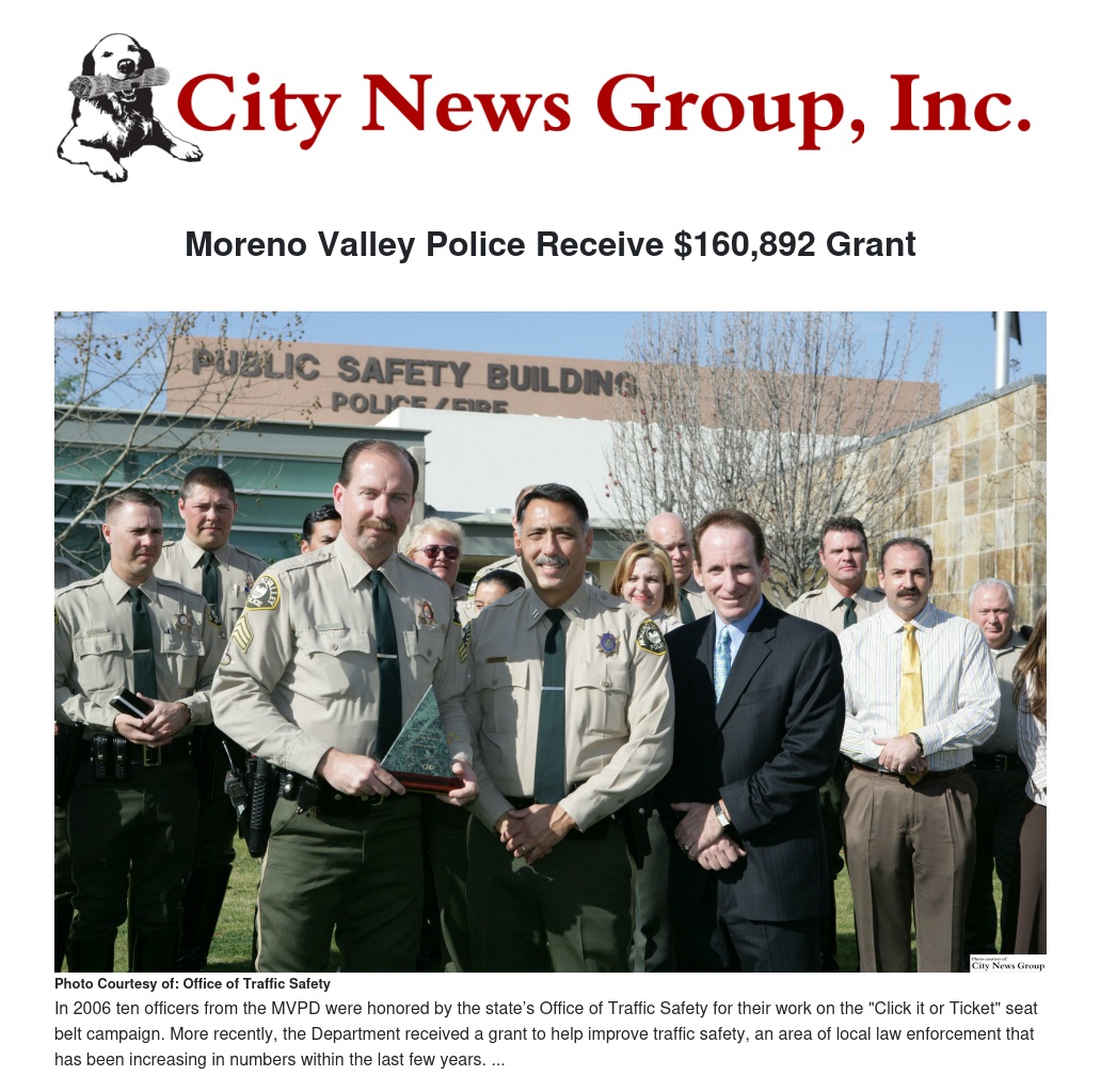 The Moreno Valley Police Department has been awarded a $160,892 grant from the California Office of Traffic Safety (OTS) for a year-long program of special enforcements and public awareness efforts to prevent traffic related deaths and injuries.