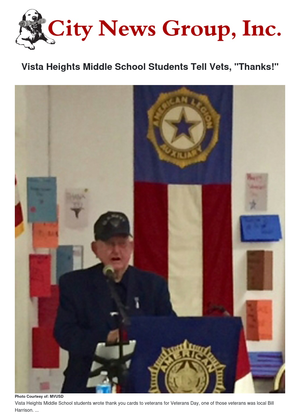 You won't hear many veterans ask for a "thanks," but everyone likes to be thanked now and then. Because of this, Vista Heights Middle School students did just that for Veterans Day -- they took the time to say "thank you" to members of the San Jacinto American Legion Post 838 and made more than 500 thank-you cards.